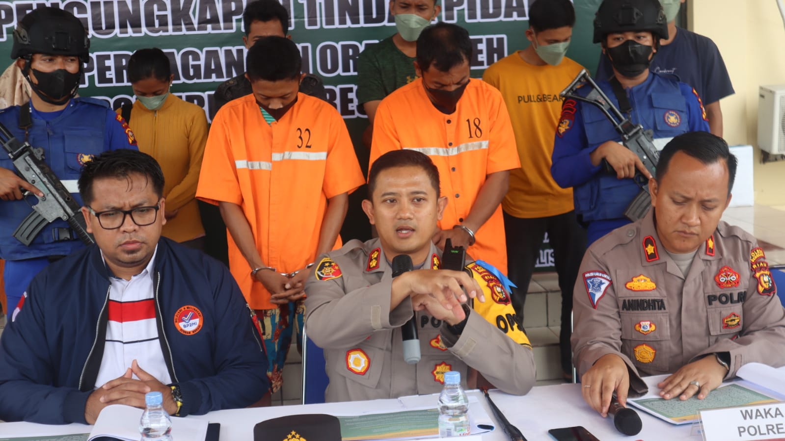 BENGKALIS, SuaraKepri.com – Polres Bengkalis melakukan press release terkait perdagangan manusia di Mapolres Bengkalis, Jalan Pertanian, Kecamatan Bengkalis, Kabupaten Bengkalis, Riau, Rabu (15/2/2023).