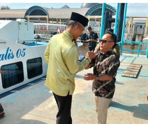 Kedatangan M Job di Pelabuhan Bandar Sri Laksamana Bengkalis disambut Bupati Bengkalis diwakili Sekretaris Daerah Bengkalis dr. Ersan TH beserta pejabat di lingkungan Pemerintah Kabupaten Bengkalis, Sabtu (5/7/2025).