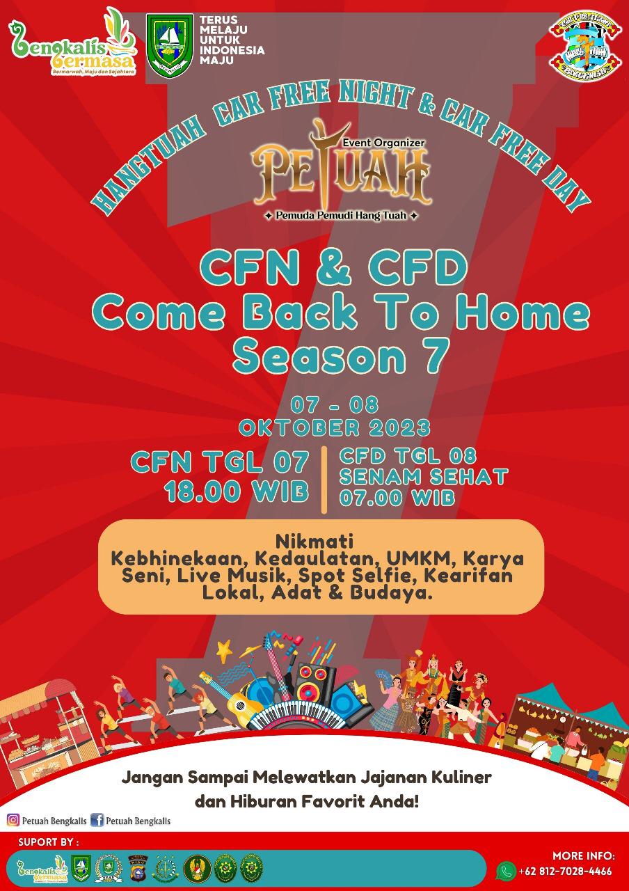 BENGKALIS, suarakepri.com – Event Organizer PETUAH Pemuda Pemudi Hangtuah Kelurahan Kota Bengkalis, Kabupaten Bengkalis Riau, akan menggelar Car Free Night (CFN) dan Car Free Day (CFD) Come Back to Home Season 7, yang akan di gelar selama dua hari di mulai pada Sabtu dan Minggu, 7-8 Oktober 2023.
