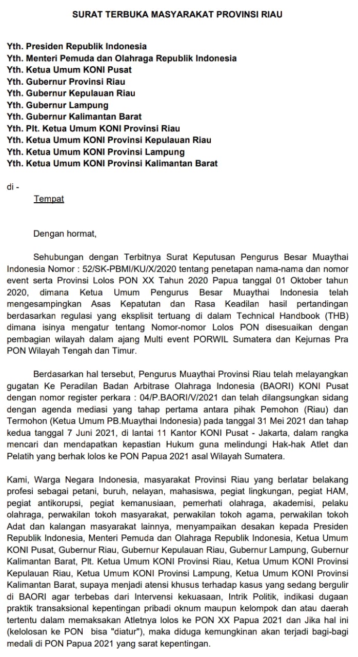 Keseriusan tersebut dibuktikan beredarnya “Surat Terbuka” masyarakat Provinsi Riau yang ditujukan kepada Presiden Republik Indonesia, Menpora, Ketum KONI Pusat, Gubernur Riau, Gubernur Kepri, Gubernur Lampung, Gubernur Kalbar, Plt. ketum KONI Riau, Ketum KONI Provinsi Kepri.