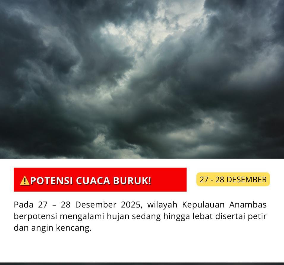 Anambas, Suarakepri.com – Badan Penanggulangan Bencana Daerah (BPBD) Kabupaten Kepulauan Anambas mengimbau masyarakat untuk meningkatkan kewaspadaan menyusul informasi resmi dari Badan Meteorologi, Klimatologi, dan Geofisika (BMKG) terkait potensi cuaca buruk pada 27–28 Desember 2025.