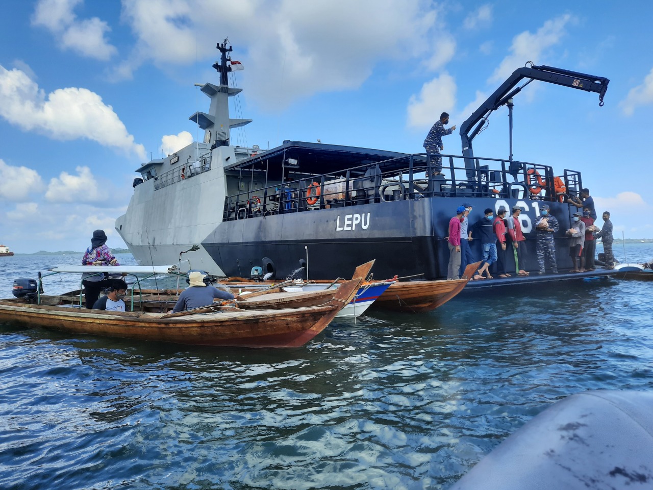 Batam, SuaraKepri – Dimasa pandemi Covid-19 dan dalam rangka Peringatan HUT ke-76 RI, KRI Lepu-861 yang merupakan unsur jajaran Satrol Lantamal IV Tanjungpinang dibawah kendali taktis Komandan Gugus Keamanan Laut Komando Armada I (Danguskamla Koarmada I), Laksamana Pertama TNI Haris Bima Bayuseto, S.E., M.Si., pada Operasi Pamtas Indonesia-Singapura 2021, melaksanakan Serbuan Bansos dengan memberikan bantuan berupa paket sembako kepada nelayan yang dijumpai di laut di daerah operasi, Minggu siang (08/8/2021).
