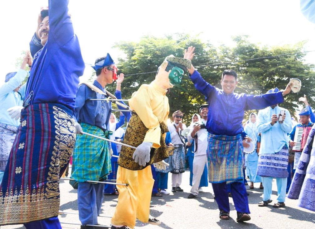 Bintan, SuaraKepri – Pawai Ta’ruf MTQ Ke VII Tingkat Provinsi Kepulauan Riau begitu semarak. Suasana semakin meriah dan heboh manakala Bupati Bintan H. Apri Sujadi, S.Sos dengan menggunakan “topeng awang” berlenggak-lenggok bak penari tradisional melayu makyong.