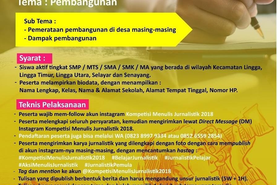 Marwahkepri.com serta Suarakepri.com yang berada di Daik, Ibu Kota Kabupaten Lingga, Kepulauan Riau menggelar Kompetisi Menulis Jurnalistik tingkat pelajar tahun 2018.