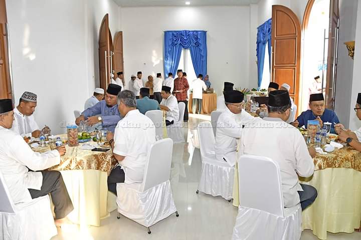 Kegiatan halal bihalal dalam rangka menyambut bulan Suci Ramadhan 1440 hijriyah ini, diakhiri dengan makan bersama dihalaman Rumah Dinas Bupati Hamid Rizal. (HMS)