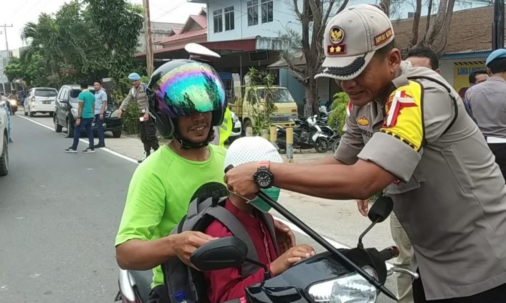 Pada kesempatan itu, Kapolres Natuna langsung memberikan sekaligus memasang Masker ke Pengendara Sepeda Motor.