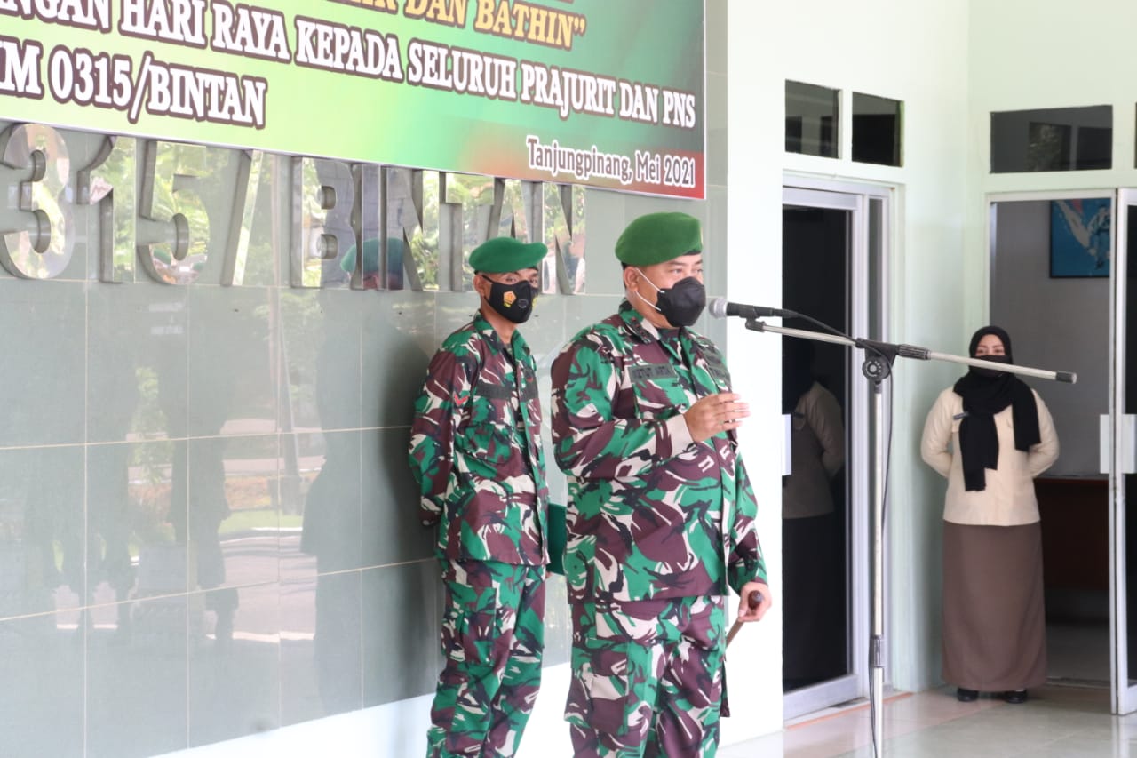 “Pelaksanaan hari raya tahun ini berbeda dengan tahun sebelumnya. Ini semua karena dampak dari Covid-19 yang sedang melanda dunia termasuk negeri kita Indonesia tercinta,” kata Dandim 0315/Bintan saat memberikan sambutan pada apel penyerahan bingkisan dan THR.