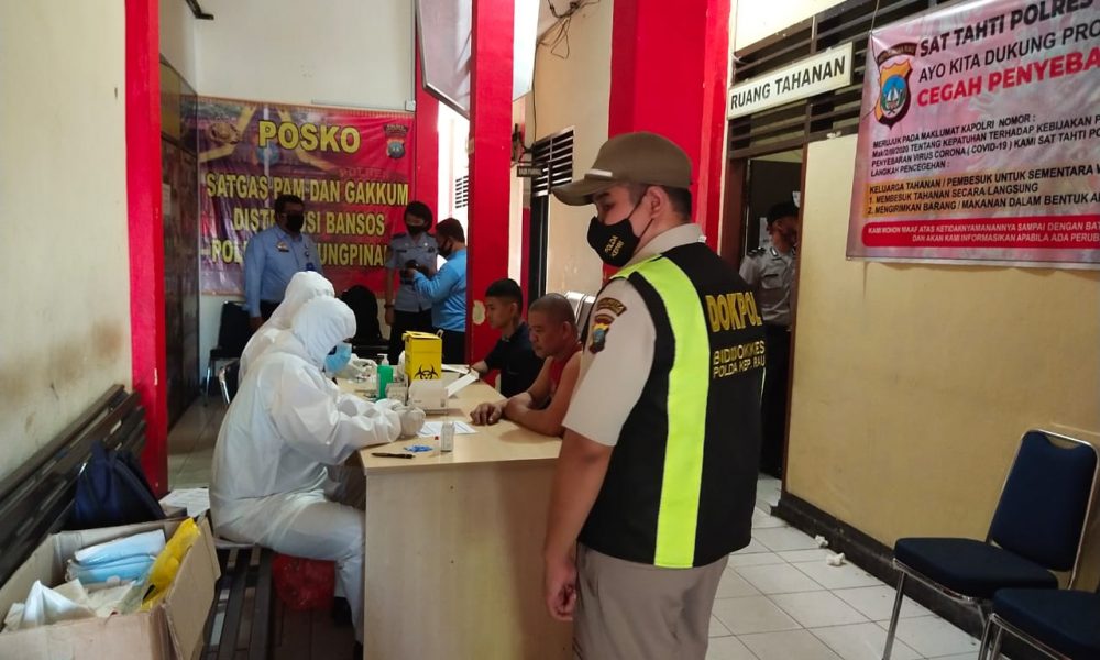 Tanjungpinang, SuaraKepri – Polres Tanjungpinang melalui jajaran Sat Tahti dan Urkes menggelar uji cepat / rapid test tahanan yang ada di rutan Polres Tanjungpinang bertempat di lobi rutan Polres Tanjungpinang, Senin (15/6/2020).
