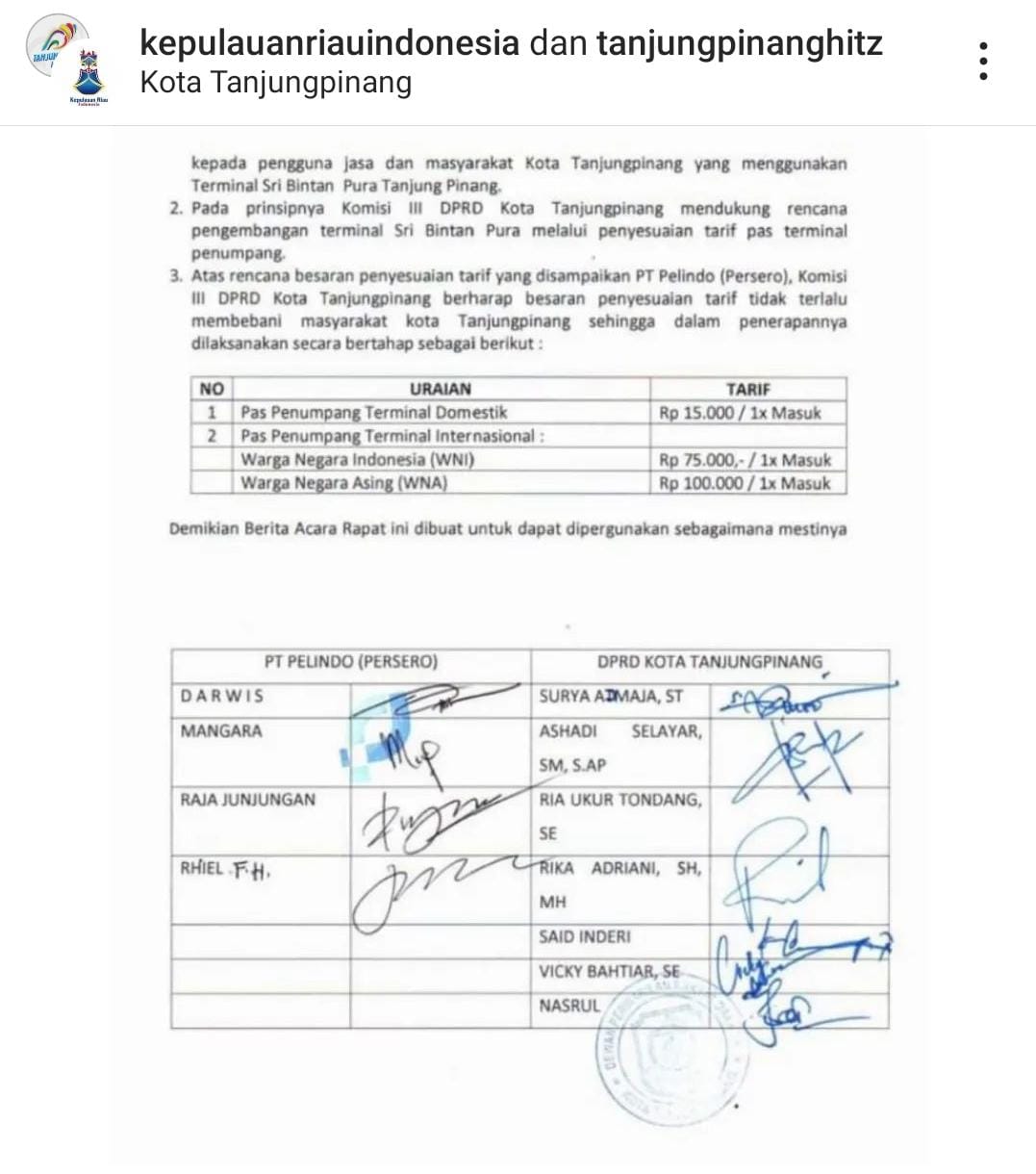 Dalam grub itu, Tok Oom (BI) mengshare foto Berita Acara antara PT Pelindo dan Komisi III DPRD Kota Tanjungpinang berjumlah 6 orang yang intinya mensepakati kenaikkan tarif Pas Pelabuhan SBP.