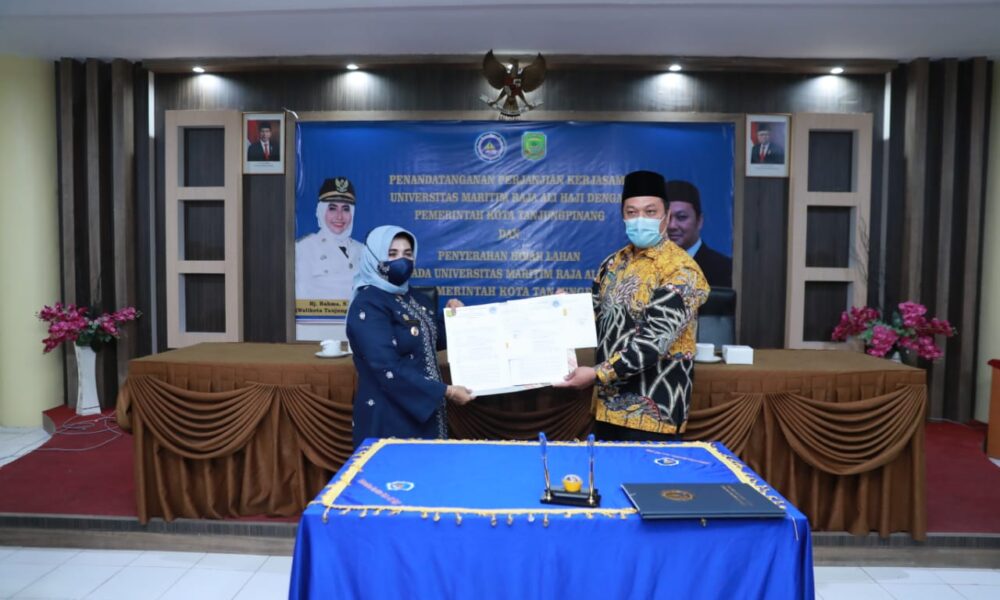 Tanjungpinang, SuaraKepri- Legalitas tanah kampus Universitas Maritim Raja Ali Haji (UMRAH) yang berada di Senggarang kini sudah jelas. Pemerintah Kota Tanjungpinang telah menghibahkan tanah seluas 6,6 hektare kepada pihak UMRAH yang ditandai dengan penandatanganan naskah serah terima antara Walikota Tanjungpinang bersama Rektor UMRAH, Rabu (30/9) di Kantor Rektorat UMRAH, Dompak.