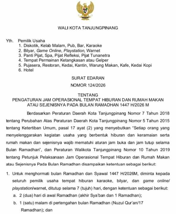 Tanjungpinang, suarakepri.com – Pemerintah Kota Tanjungpinang resmi menerbitkan Surat Edaran Nomor 124/2026 tentang Pengaturan Jam Operasional Tempat Hiburan dan Rumah Makan atau Sejenisnya pada Bulan Ramadan 1447 Hijriah/2026 Masehi. Kebijakan tersebut diteken Wali Kota Tanjungpinang, Lis Darmansyah, pada 13 Februari 2026.