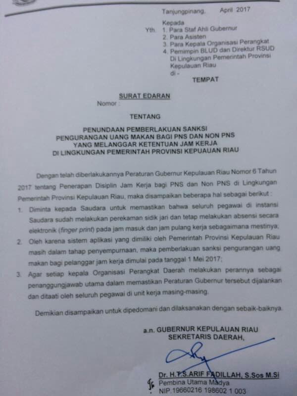 “Oleh karena sistem aplikasi yang dimiliki Pemerintah Provinsi Kepri masih dalam tahap penyempurnaan. Maka pemberlakuan sangsi ke pengurangan uang makan bagi pelanggar jam kerja di mulai pada tanggal 1 Mei 2017 mendatang,” intruksi Arif dalam isi surat bertanggal April 2017.