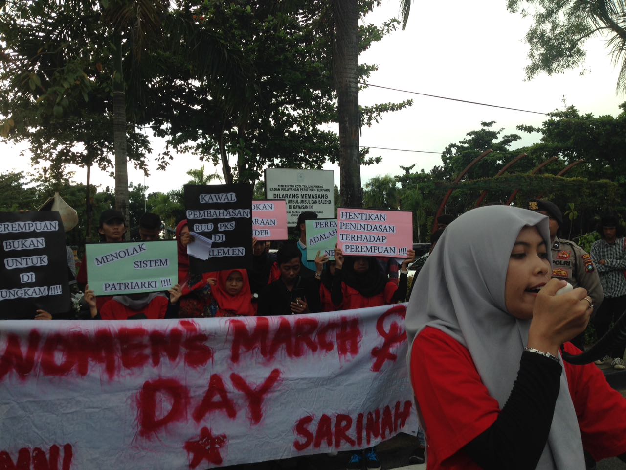 “Apa bila perempuan diposisikan tertinggal, maka akan sulit bagi perempuan untuk menjadi mitra sejajar laki-laki, sehingga hubungan keduanya akan menjadi timpang,” ungkap salah satu Sarinah Gesti dalam orasinya.