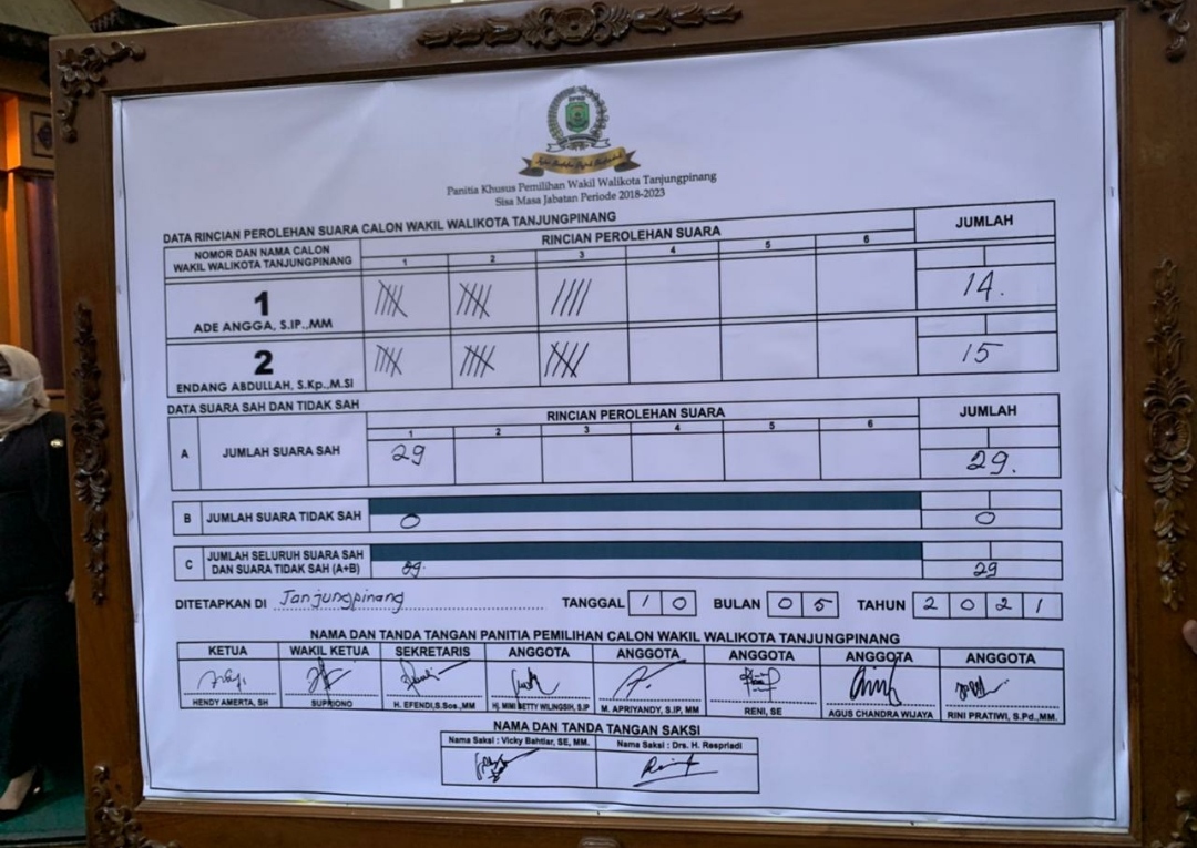Nomor urut 1 Ade Angga yang diusung oleh partai Golkar meraih 14 suara, sedangkan nomor urut 2 Endang Abdullah yang diusung partai Gerindra memperoleh 15 suara dari 29 orang anggota DPRD Kota Tanjungpinang yang hadir.