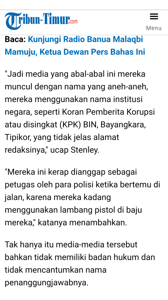 “Jadi media yang abal-abal ini mereka muncul dengan nama yang aneh-aneh, mereka menggunakan nama institusi negara, seperti Koran Pemberita Korupsi atau disingkat (KPK) BIN, Bayangkara, Tipikor, yang tidak jelas alamat redaksinya,” begitulah kutipan pernyataan tegas dari Stanley pada saat itu.